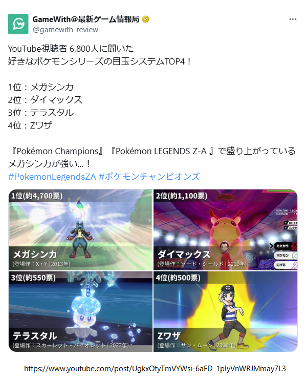 メガシンカは次回作では誰に来るかなっていうワクワクはあるよね。キョダイマックスあるダイマ以外の他2つはそれがない。でもダイマとも大きな票差があるとは思わなかった