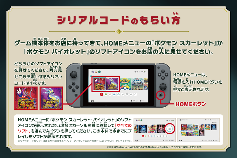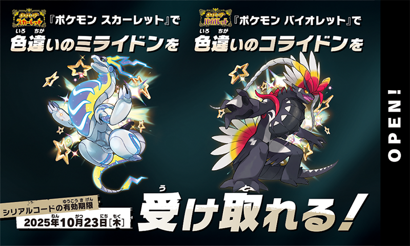 >全国のゲーム取り扱い店(コンビニエンスストアや、一部店舗を除く)で、『ポケットモンスター スカーレット』には色違いのミライドンを、『ポケットモンスター バイオレット』には色違いのコライドンがもらえるシリアルコードをプレゼント。