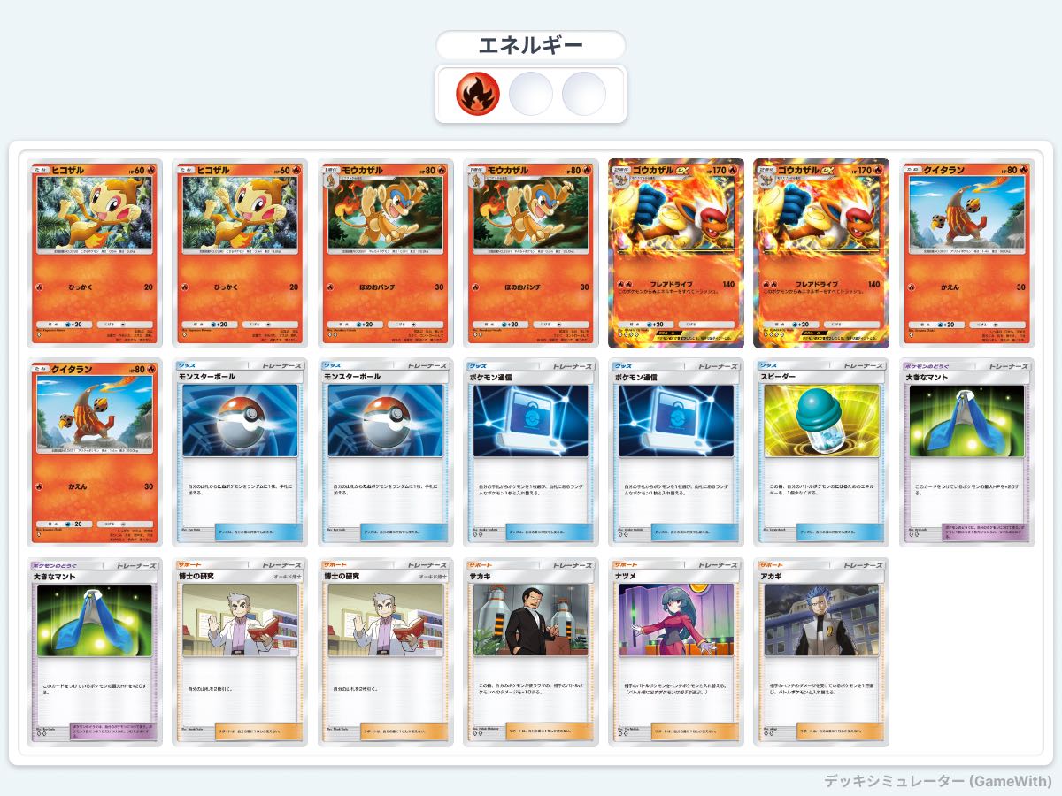 リザードン系炎デッキはリザードがHP90なせいでナッシーだと辛いなってなるけどゴウカザル系デッキはモウカザルがHP80なせいでナツメで何とかなれーってすると何とかなることが多い印象